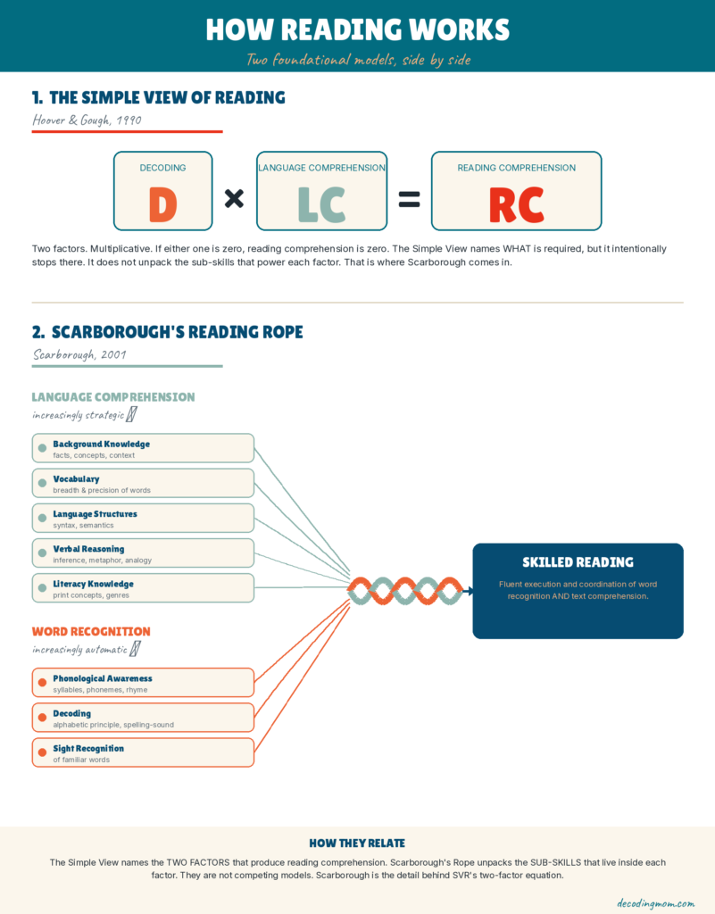 This is where the Simple View of Reading comes in, and honestly, once you understand this framework, a lot of your kid’s reading journey starts to make more sense. The Simple View of Reading says that reading comprehension is the product of two separate things: decoding and language comprehension. You multiply them together. And if either one is weak, your reading falls apart.
